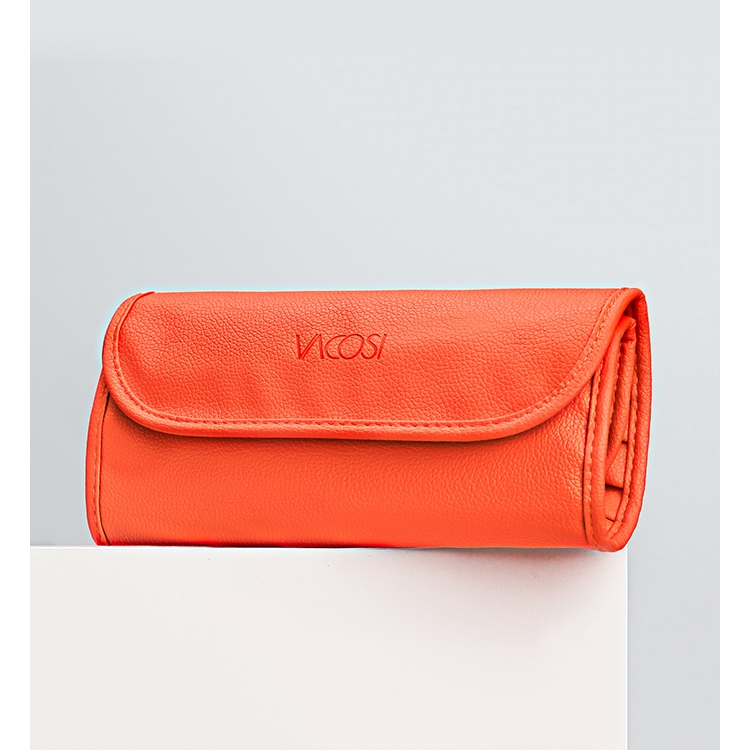 Thiết kế chuyên nghiệp dạng bóp da cầm tay, cùng sắc cam nổi bật, phong cách, giúp bảo vệ cọ khỏi tác động của bên ngoài, đồng thời giữ vệ sinh cho cọ tốt hơn.