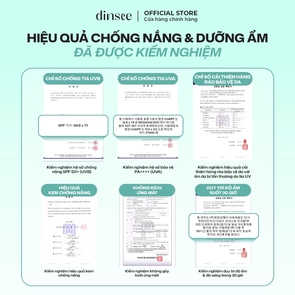 Sản phẩm phù hợp với mọi loại da, ngay cả làn da nhạy cảm. Đây không chỉ là kem chống nắng mà còn là dưỡng ẩm, làm dịu da, mang lại làn da căng mướt, bóng mượt, giúp da khỏe mạnh.MÔ TẢ SẢN PHẨM Dinsee Premium Vegan Tone Up Sun Cream là kem chống nắng nâng tone triệt sắc thuần chay với SPF50+, PA++++ và là sản phẩm Double Vegan đầu tiên của Hàn Quốc được chứng nhận bởi Châu Âu.Công thức lai giữa chống nắng vật lý và hóa học Thuần chay giúp bảo vệ tối ưu khỏi tia UVA/UVB. Điểm nổi bật của sản phẩm là khả năng dưỡng ẩm, cải thiện kết cấu da và ngăn ngừa lão hoá da. Giúp làn da hạ nhiệt ngay 5.8°C* ngay sau khi bôi, dưỡng ẩm lên đến 30h**.*, ** Kiểm nghiệm dựa trên Công ty TNHH Viện Nghiên cứu Da liễu MarieDMTHÀNH PHẦN CHÍNHKem chống nắng có màng lọc (ZinC Oxide) giúp bao bảo vệ làn da khỏi các tia UVA/ UVBNgoài công dụng chống nắng thì sản phẩm còn chưa các thành phần dưỡng da như Niacinamide, 11 chiết xuất thiên nhiên (Eugenia Caryophyllus (Clove) Bud Extract, Solidago Virgaurea (Goldenrod) Extract, Ulmus Davidiana Root Extract, Laminaria Japonica Leaf Extract, Aloe Barbadensis Leaf Extract, Viola Mandshurica Flower Extract, Dioscorea Japonica Root Extract, Stellaria Media (Chickweed) Extract, Mentha Viridis (Spearmint) Extract, Mentha Suaveolens Leaf Extract, Mentha Aquatica Extract.). Đặc biệt sản phẩm còn sử dụng thành phần Thiên Sơn Tuyết Liên tinh tuyển từ vùng núi cao với công dụng chống lão hóa dưới tác động mặt trường (UVB)**Dựa trên bài nghiên cứu “Tạp chí Nghiên cứu Dược học Dân tộc học (Journal of Ethnopharmacology” ƯU ĐIỂM NỔI BẬT - KEM CHỐNG NẮNG THUẦN CHAY ĐẦU TIÊN mang đến giải pháp chống nắng an toàn, dịu nhẹ, không kích ứng cho làn da nhạy cảm.- Chứng nhận Double Vegan đầu tiên tại Hàn Quốc theo tiêu chuẩn Châu Âu- Công thức chống nắng kết hợp thành phần dưỡng chiết xuất từ Thiên Sơn Tuyết Liên với khả năng:- KEM CHỐNG NẮNG có lớp finish căng bóng, ẩm mịn, làm dịu da tức thì với hiệu ứng giảm nhiệt 5.8°C ngay sau khi bôi.- Dưỡng ẩm suốt 30 giờ với chiết xuất Thiên Sơn Tuyết Liên quý hiếm, lô hội và chickweed.- Bảo vệ vững chắc, chăm sóc tối ưu - cải thiện hàng rào bảo vệ & làm dịu da tới 21.2%- An toàn cho da nhạy cảm đã được kiểm nghiệm.- Được kiểm nghiệm không gây kích ứng, không gây cay mắt.(Hình ảnh kiểm nghiệm)HƯỚNG DẪN SỬ DỤNG:Bước 1: Sử dụng kem chống nắng sau skincare, trước makeupBước 2: Sử dụng khoảng 1-2ml hoặc 2 lóng tayBước 3: Sử dụng trước 30 phút khi tiếp xúc và ánh nắng Bước 4: Re-apply sau 4h