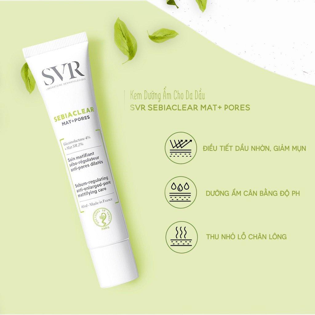 2.Kem dưỡng SVR Sebiaclear Mat + Pores là kem dưỡng ẩm giúp điều tiết bã nhờn và làm se khít lỗ chân lông, kiềm dầu lên tới 8 giờ mà vẫn duy trì độ ẩm cho da.