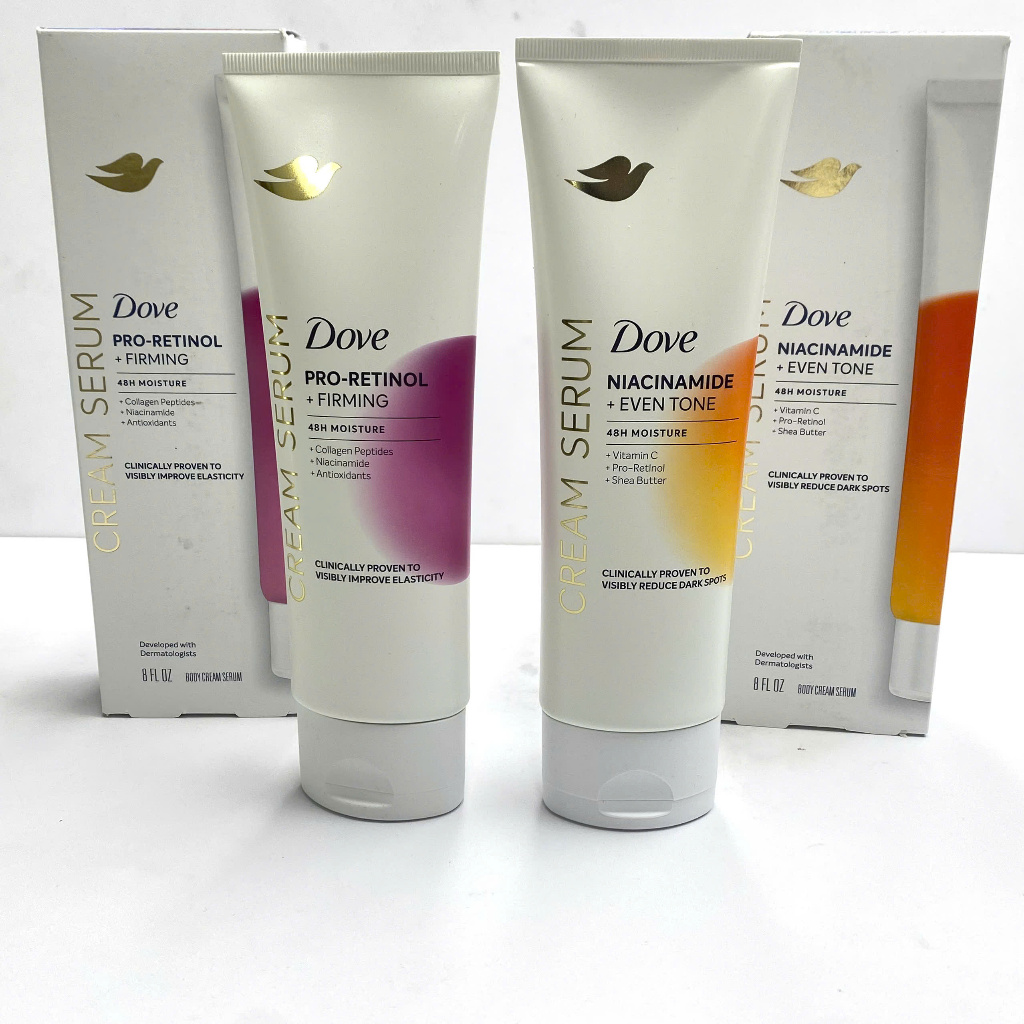 Dove Body Cream Serum Pro-Retinol + Firming - Thành phần chính gồm có: Pro retinol, Peptide Collagen, Niacinamide và các hoạt chất chống oxy hóa giúp da săn chắc,mịn màng, làm chậm quá trình lão hóa - Chất kem serum thẩm thấu nhanh, giúp nuôi dưỡng làn da từ bên trong mà không gây bết dính Dove Body Cream Serum Niacinamide + Even Tone - Thành phần chính gồm có: Niacinamide, Vitamin C, Pro retinol và bơ hạt mỡ giúp làm sáng, đều màu da - Chất kem serum thẩm thấu nhanh, giúp nuôi dưỡng làn da từ bên trong mà không gây bết dính Dung tích: 8 oz (236ml)