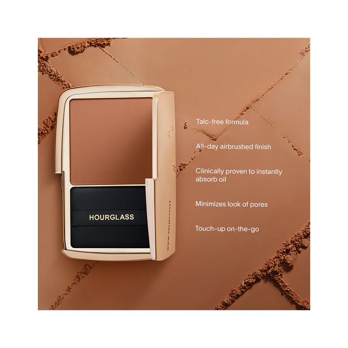 Phấn phủ dạng nén Hourglass không chứa talc, giúp kiềm dầu, làm mờ mịn khuyết điểm mà không hề đọng phấn trên nếp nhăn.