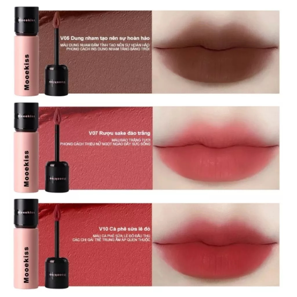 Son bùn Mooekiss là dòng son kem lì nội địa Trung nổi bật với chất son bùn (lip mud) mềm mịn như nhung, dễ tán, che phủ rãnh môi tốt và để lại lớp finish lì mờ tự nhiên. Sản phẩm có thiết kế nhỏ gọn, đa năng có thể dùng cho cả môi và má, bảng màu thời thượng, đặc biệt tôn da. Các đặc điểm nổi bật của son bùn Mooekiss:- Kết cấu : Chất son bùn xốp mịn, khi thoa tạo hiệu ứng mờ lì (blur velvet) nhưng không gây khô hay nặng môi.- Độ che phủ & Lên màu: Khả năng lên màu chuẩn ngay từ lần quẹt đầu tiên và che phủ tốt rãnh môi, không lộ vân môi.- Thiết kế: Dạng son kem tròn nhỏ gọn, thường có nắp đen hoặc đỏ, thân vỏ màu hồng pastel, tiện lợi mang theo.- Tính đa năng: Có thể tận dụng làm má hồng hoặc phấn mắt, tạo phong cách trang điểm đồng màu.- Độ bền màu: Lâu trôi, giữ màu tốt trong nhiều giờ.